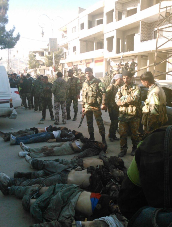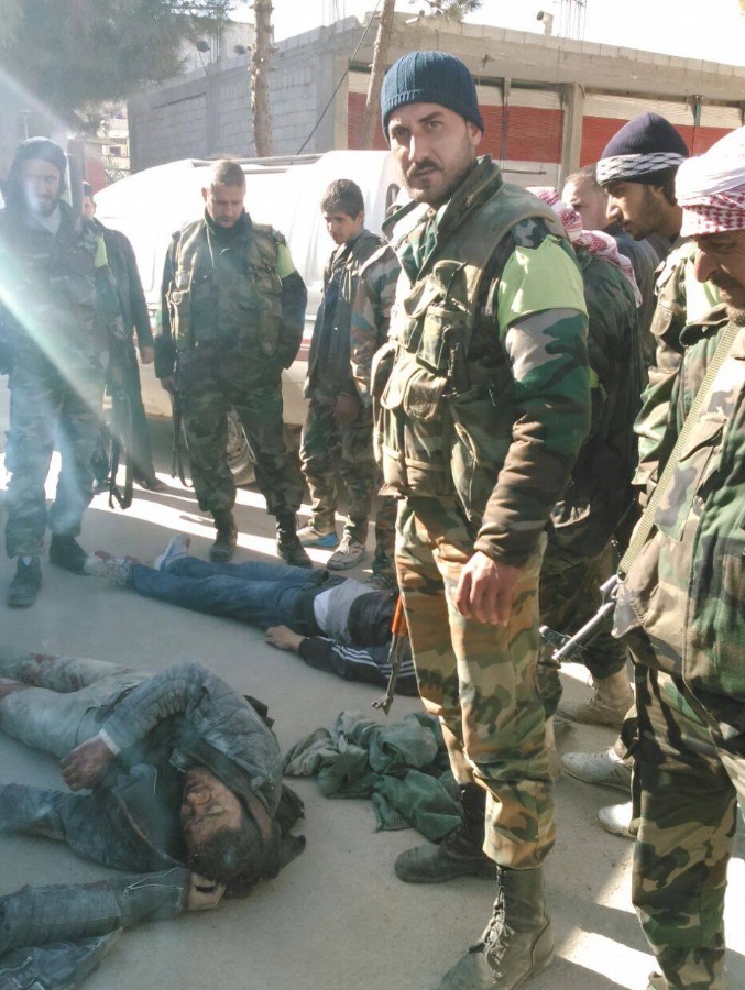 مقاتل في صفوف النظام السوري، قام بالتقاط صور لجثث في مدينة عدرا بريف دمشق