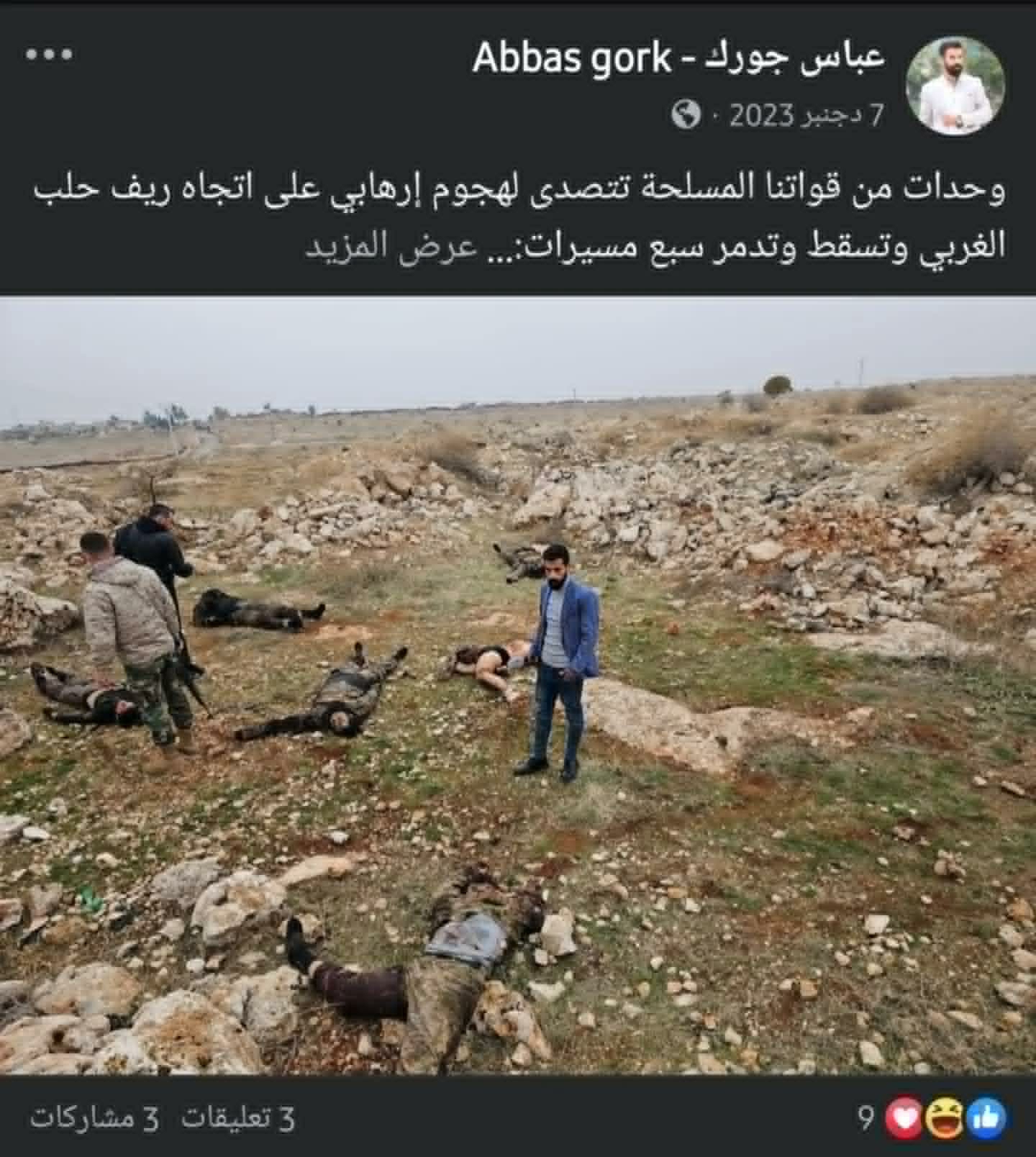 مراسل قناة سما الفضائية، من أبرز الإعلاميين الداعمين لنظام الأسد وحزب الله، نشر صوراً يقف فيها بجانب جثامين من الثوار قُتِلوا على يد جيش النظام المخلوع في محافظة حلب،