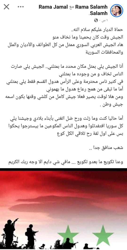 من صافيتا بريف طرطوس، إعلامية ميدانية لجهات غير معروفة، ولكنها تنقلت بين قوات الجيش ورافقتهم لفترة، ومن ثم عملت بالمجال الإنساني، في 1 آب 2025 نشرت بوست تتغنى بجيش الأسد وقالت بأن الجيش اليوم يخيف الناس والجيش السابق كان يبعت الطمأنينة بقلوب الشعب، ومن ثم قامت نشر اعتذار وادّعت بأن حسابها كان مخترق.
