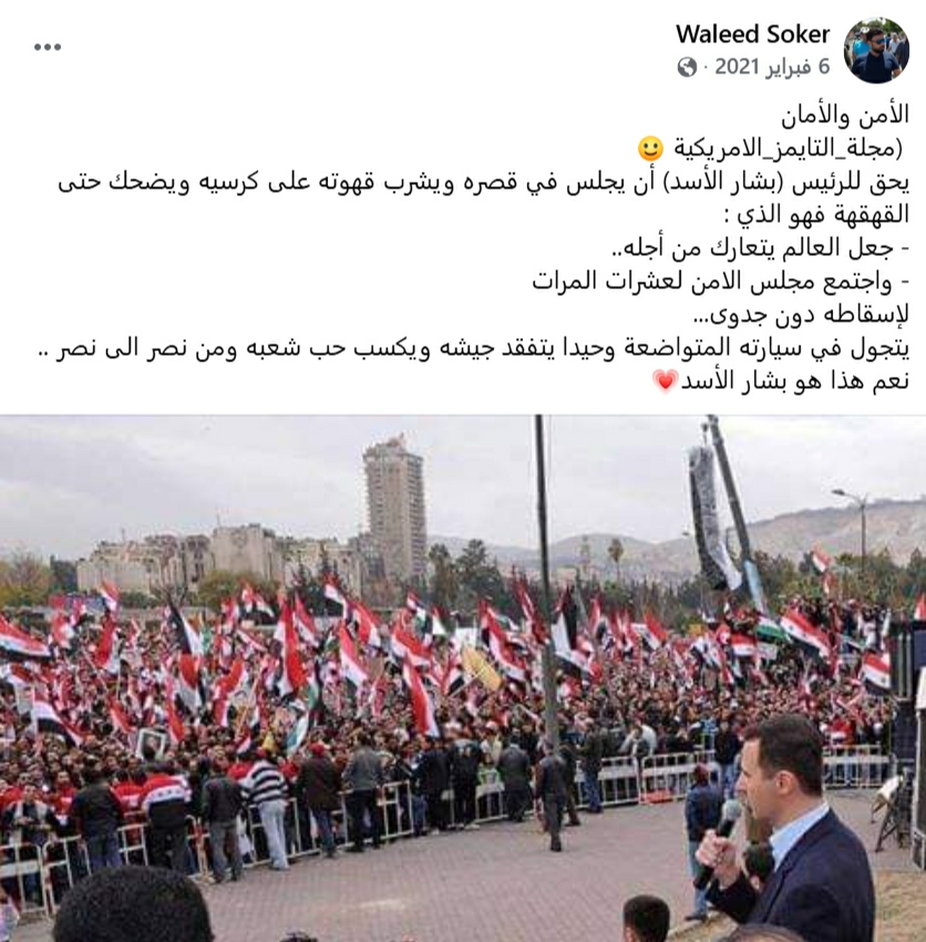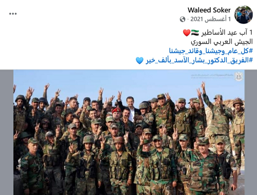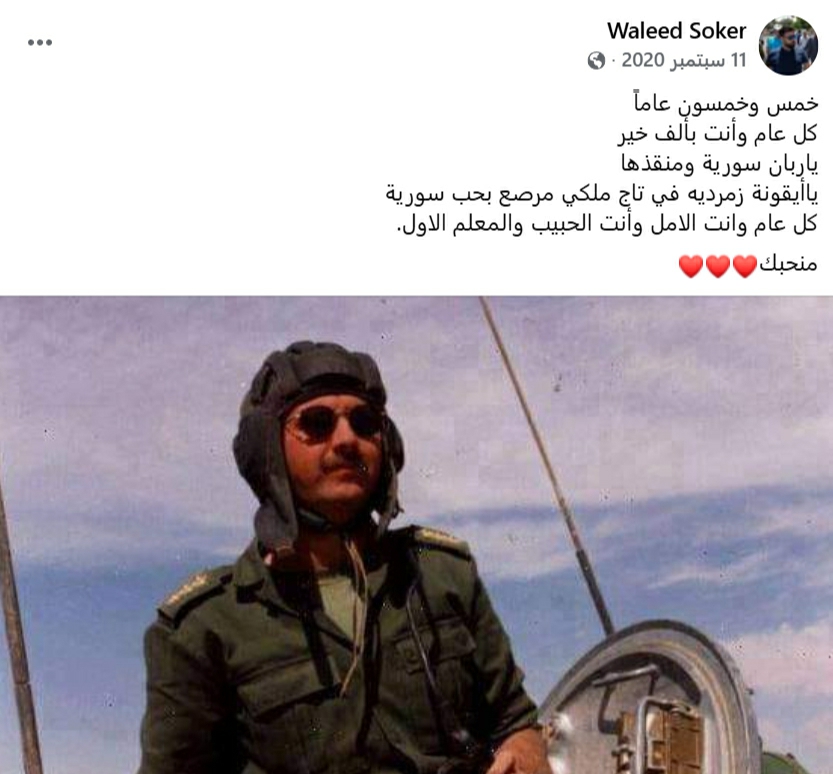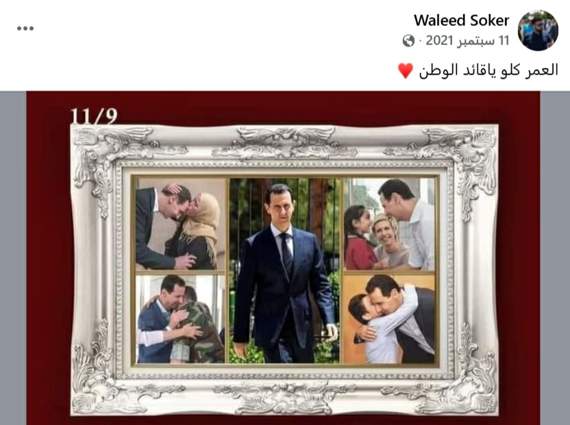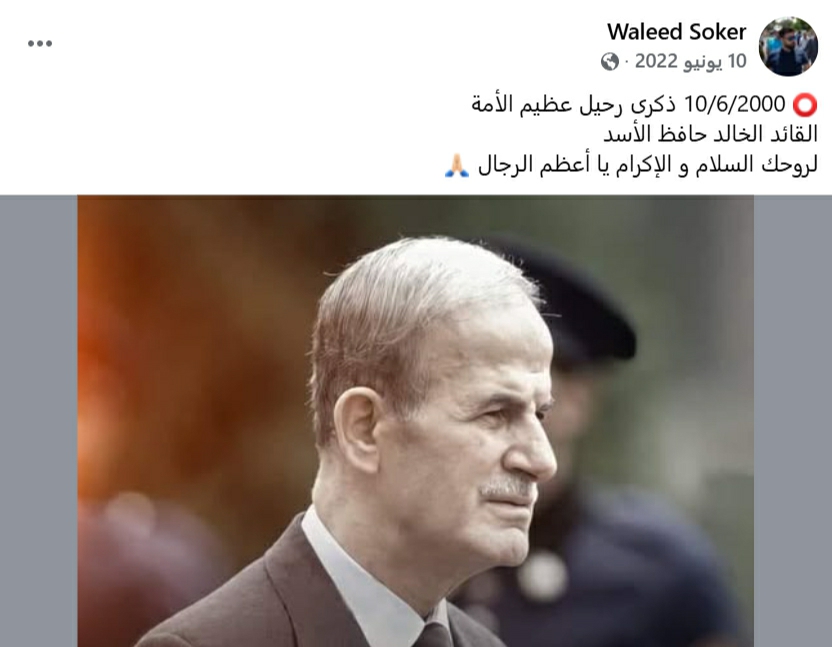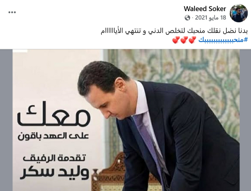 هذا ليس شخصاً مؤيداً للأسد فحسب، بل عاشقه وعابداً له، حسابه على فيسبوك يحتوي آلاف الصورة التي يمجّد بها ماهر وبشار الأسد وجيشهم وميليشياتهم، كما نشر مئات الصور لدعم الحملات الانتخابية لرئاسة الجمهورية، وهو الآن ممثل أمانة عدة أحياء بدمشق وهم: ساروجة – حي مسجد الأقصاب – حي العمارة البرانية، كما يدير صفحة “العباسيين نبض العاصمة”.