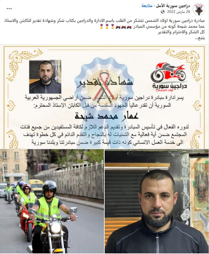مساعد متطوع في الحرس الجمهوري اللواء 106 دبابات، وهو من قرية خربة التين في محافظة حمص، ومرافق شخصي للعميد المجرم محمد خضور، نشط عمار بعمله في ريف دمشق وتحديداً في الغوطة الشرقية وارتكب العديد من الجرائم هو واللواء الذي ينتمي اليه، ومن ثم انتقل هو ومجموعته للعمل في مدينة حلب، عمل ضمن مبادرة دراجين سوريا وهي مبادرة لتوزيع المساعدات للمحتاجين، كما افتتح محل للوشوم في منطقة المزة في مدينة دمشق، وفي عام 2012 انتشر مقطع فيديو مسرّب من هاتف أحد شبيحة النظام السوري، يظهر في الفيديو مجموعة من الشبيحة بلباس عسكري، يقودون شابان إلى مدخل أحد الأبنية في شارع ضيق في حي العرقوب في حلب، حيث تم اعدام أحدهم هناك وهو الشاب يوسف كور.
