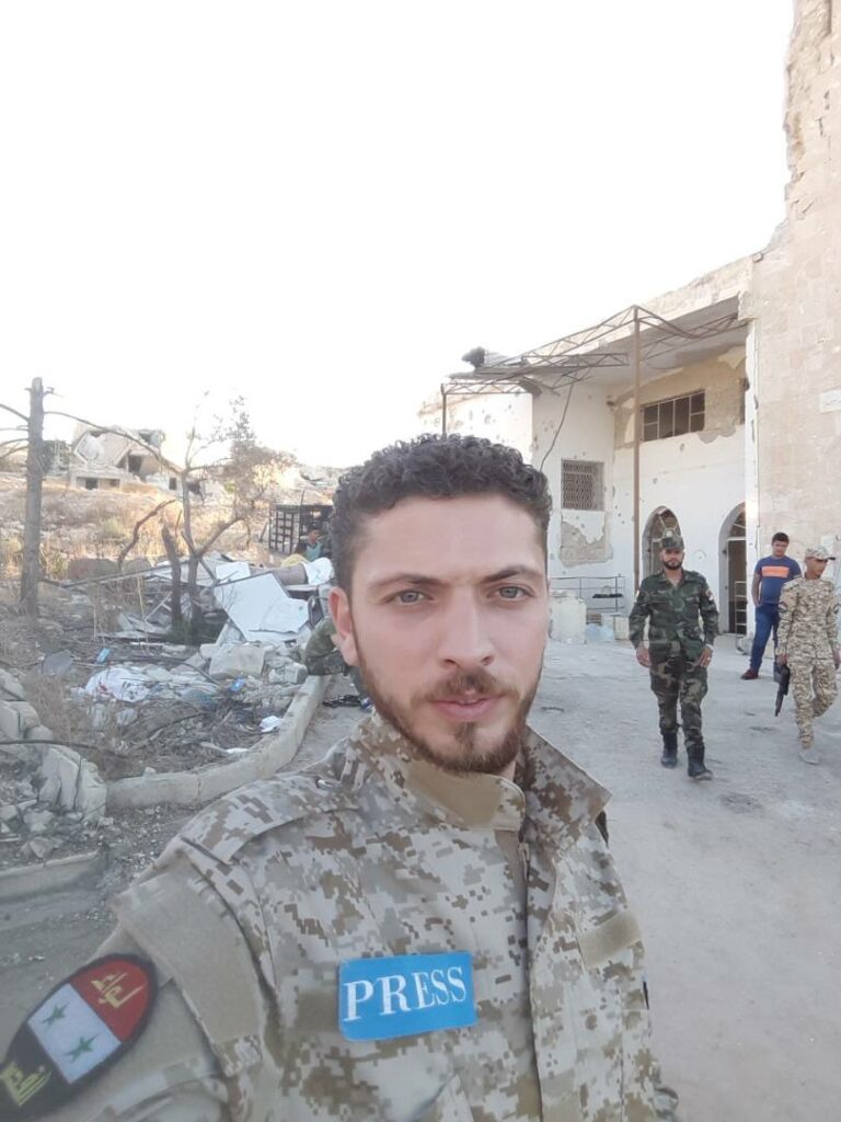 كان مدعوماً من المجرم سهيل الحسن ورافق قوات النظام البائد وقام بتغطية معاركهم في حلب لصالح وكالة سانا، كما أنه عمل كإعلامي ضمن صفوف ميليشيا لواء القدس في حلب، بقي في صفوف النظام البائد حتى تحرير مدينة حلب ودحر عصابات الأسد وإيران منها، متواجد حالياً في حي مساكن الفردوس بمدينة حلب.